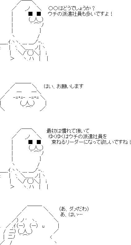 最初は希望に近い仕事(工場)で働けそうな感じで良かったんだけど、急に派遣先のリーダー云々って言い出しから、これはダメだと思った。